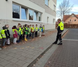 Letzte Woche übernahm Herr Tappe für eine Doppelstunde den Unterricht in den ersten Klassen. Er erklärte, wie wichtig es ist, im Straßenverkehr sichtbar zu sein.