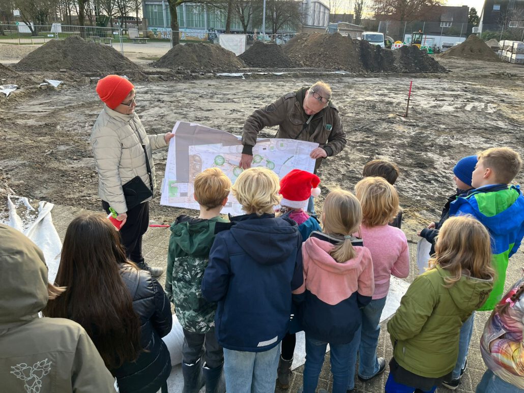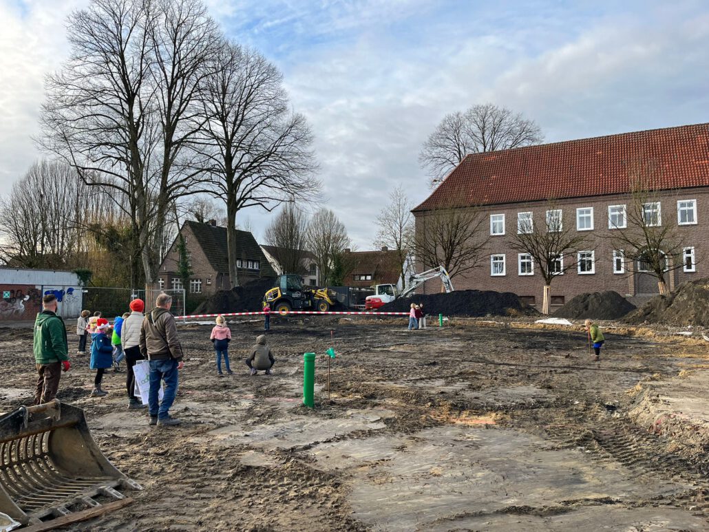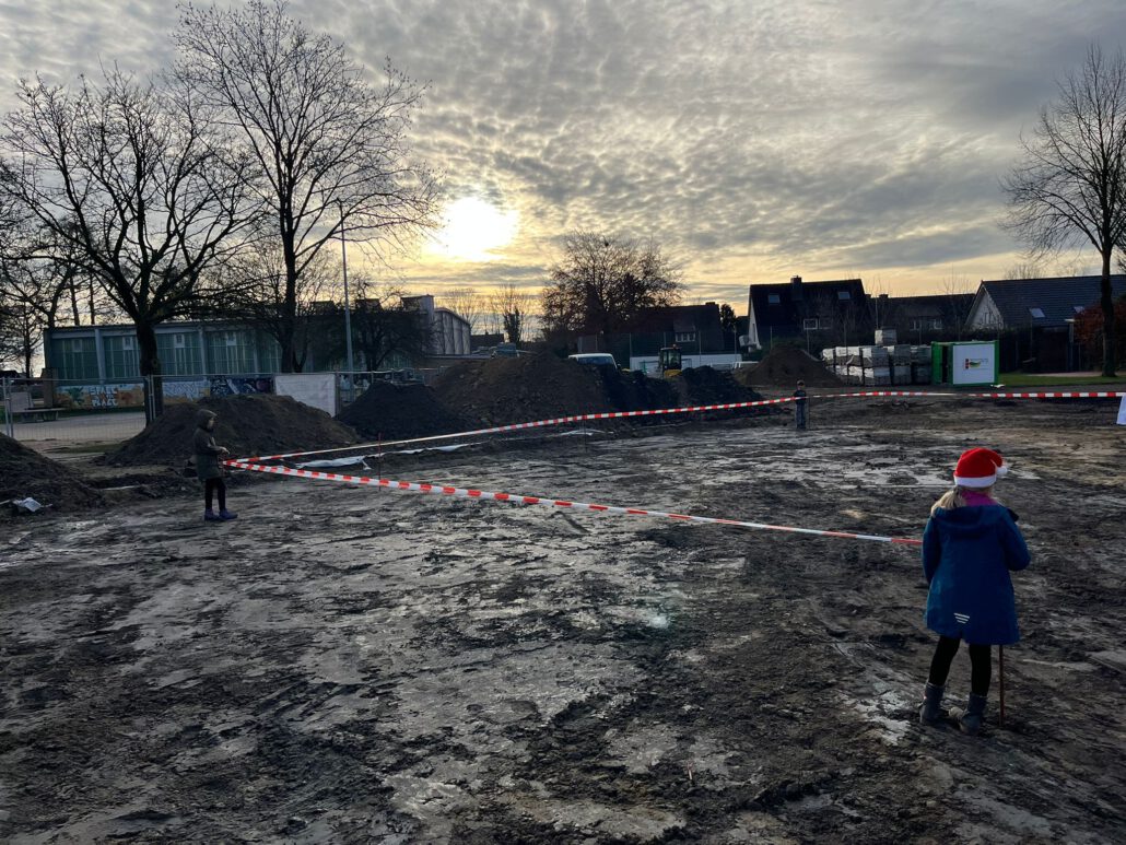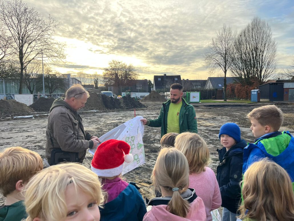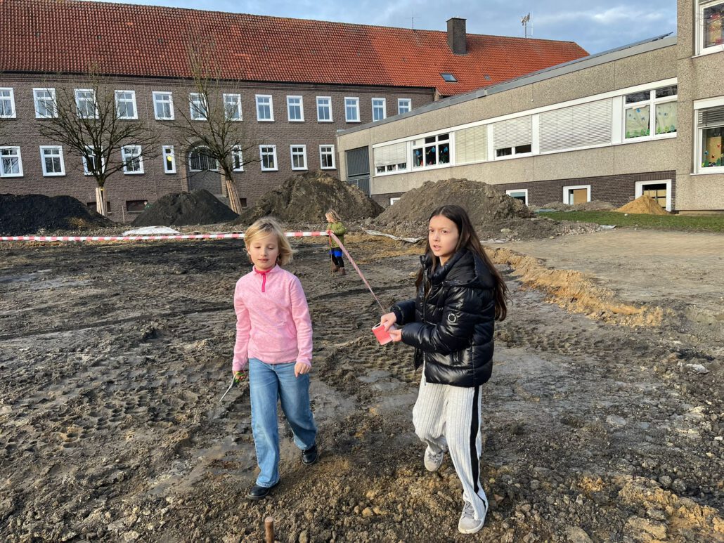 Große Freude herrschte bei den Mitgliedern des Kinderparlaments, die von der Gemeinde Laer zu einer Baustellenbesichtigung des Schulhofs eingeladen worden waren. Frau Mattenklotz vom Planungsbüro Rein erklärte gemeinsam mit Herrn Bode, Herrn Mucaj und Frau John von Münsterland plus die geplanten Umbaumaßnahmen des Schulhofs. Mit großem Interesse verfolgten dies die Kinder und bekamen sogar eigene Pläne für ihre Klasse, um diese dann im Klassenrat vorstellen zu können. Gemeinsam durften sie dann das geplante grüne Klassenzimmer sowie den Sandkasten mit Flatterband kennzeichnen, um ein Gefühl für deren Größe zu bekommen. Für die Kinder eine großartige Erfahrung, so in die Planung und Umsetzung der Baumaßnahmen mit einbezogen worden zu sein. Einen herzlichen Dank.