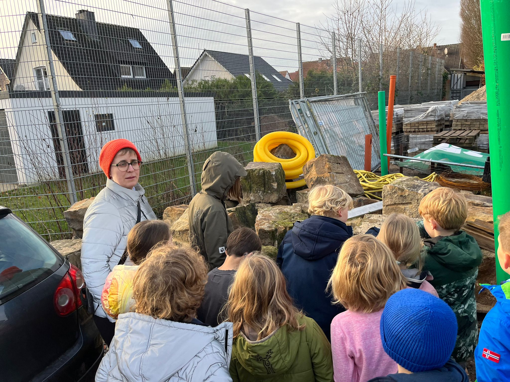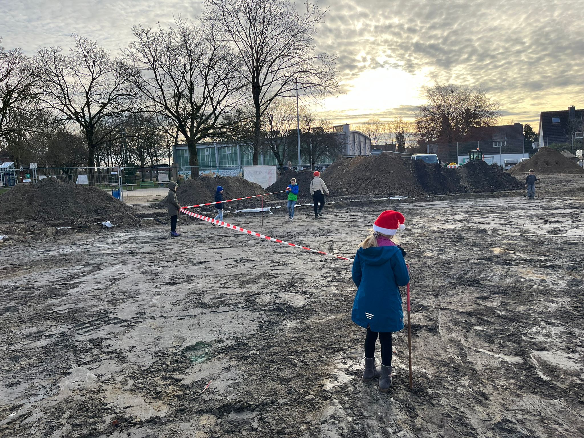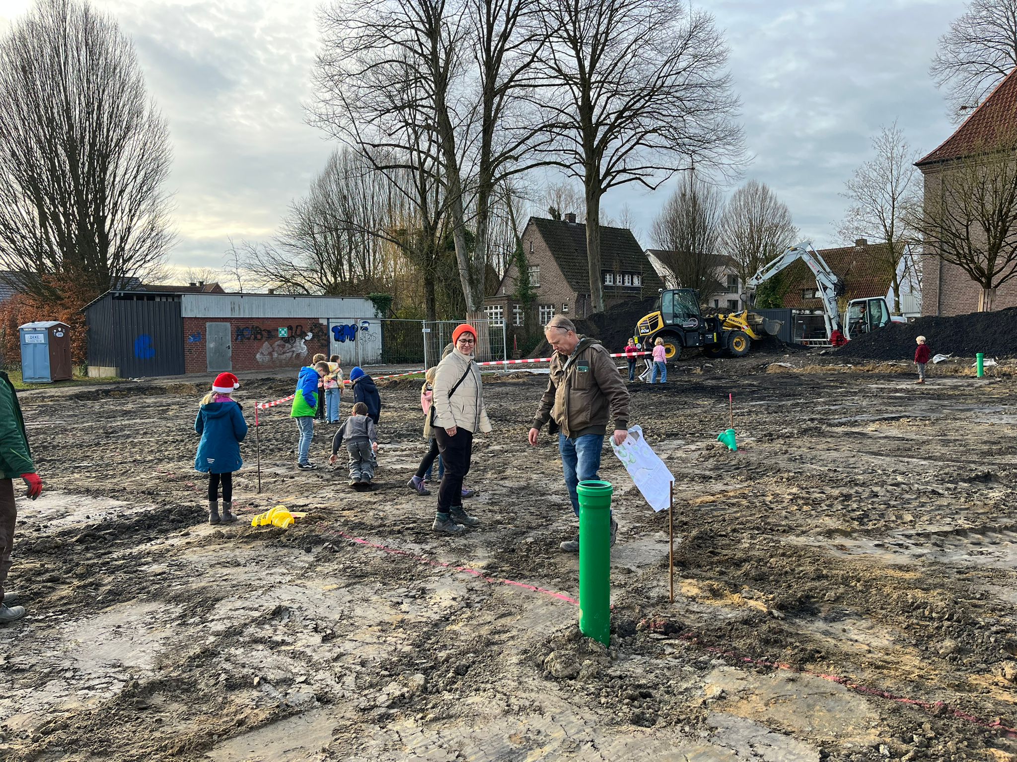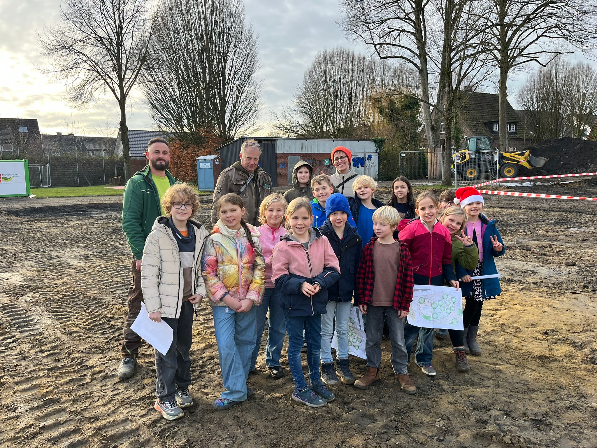 Große Freude herrschte bei den Mitgliedern des Kinderparlaments, die von der Gemeinde Laer zu einer Baustellenbesichtigung des Schulhofs eingeladen worden waren. Frau Mattenklotz vom Planungsbüro Rein erklärte gemeinsam mit Herrn Bode, Herrn Mucaj und Frau John von Münsterland plus die geplanten Umbaumaßnahmen des Schulhofs. Mit großem Interesse verfolgten dies die Kinder und bekamen sogar eigene Pläne für ihre Klasse, um diese dann im Klassenrat vorstellen zu können. Gemeinsam durften sie dann das geplante grüne Klassenzimmer sowie den Sandkasten mit Flatterband kennzeichnen, um ein Gefühl für deren Größe zu bekommen. Für die Kinder eine großartige Erfahrung, so in die Planung und Umsetzung der Baumaßnahmen mit einbezogen worden zu sein. Einen herzlichen Dank.